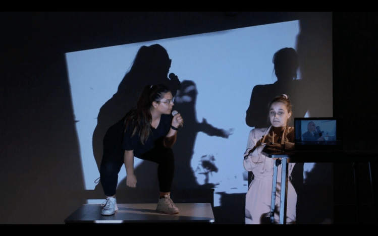 Diese Arbeitsweise greift die Spiel- und Inszenierungspraxis der „wooster group“ auf, die in New York seit den 1970’er Jahren theatrale Praxis als Dopplung und Parallelität zum Kino sowie zur abgefilmten Bühne innerhalb postdramatischer Produktionen erschlossen hat.