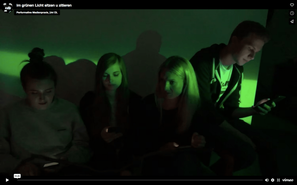 2019/20 langweilig, ekelhaft, sinnlos und zermürbend https://vimeo.com/user127201488/review/536209847/7d783b6cee – Bilder vom Krieg gegen Krieg? In der Lehrveranstaltung wurde eine defensive Bestandsaufnahme von Filmmaterialien über Krieg erarbeitet. Gemeinsame Sichtung und Diskusion des Films They Shall Not Grow Old von Peter Jackson (2018) mit Soldatinnen/Soldaten am Standort Oldenburg im Cine_k.
