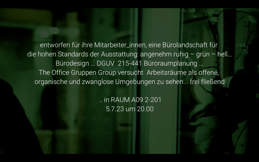 Studierende aus der Lehrveranstaltung „von Kunst reden wir später“ und „Found Footage“ präsentierten während der Showtime ’23 eine Videobühne als organisch – zwanglose Büroraumerfahrung. Crtl+r from reality : angenehm ruhig – grün – hell: eine frei fließende Umgebung für formlose Meetings voll Prestige, nachhaltiger Lebensentwürfe und Permanenzen in der Bürolandschaft
